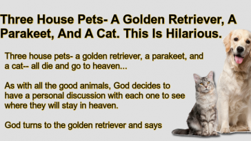 Three House Pets- A Golden Retriever, A Parakeet, And A Cat.