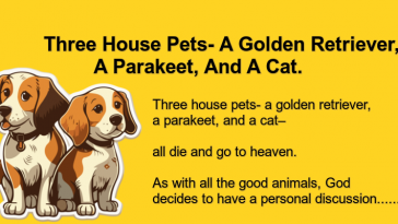 Three House Pets- A Golden Retriever, A Parakeet, And A Cat.